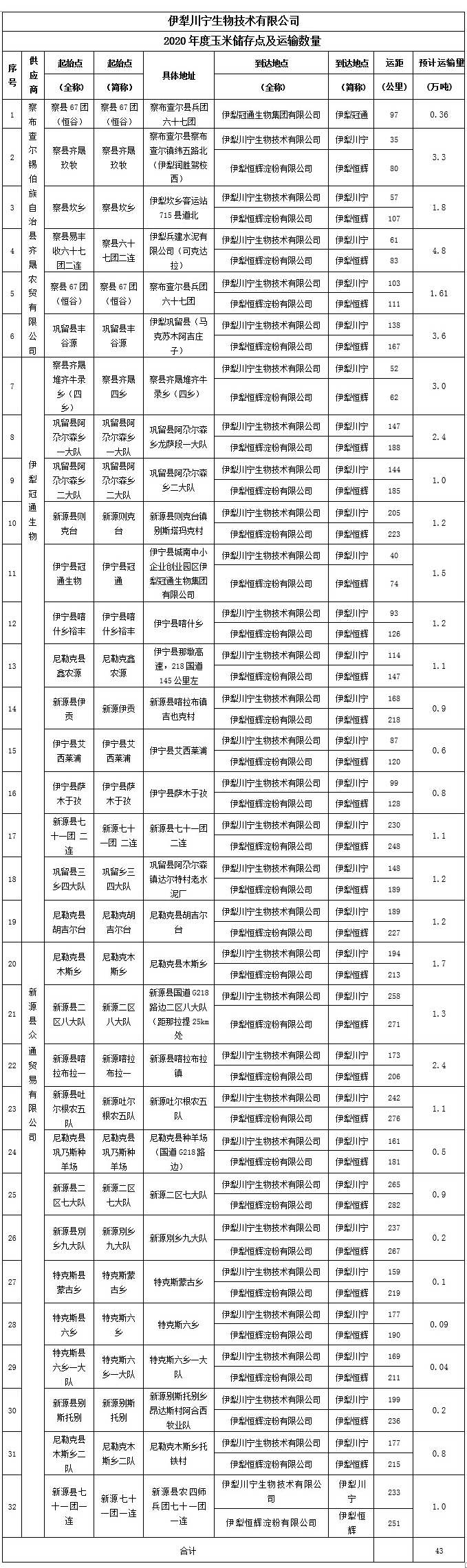 1、2020年(2020年01月01日至2020年12月31日)计划玉米运输招标数量43万吨,由三家供应商在伊犁州六县范围共设32个收储粮点代储。