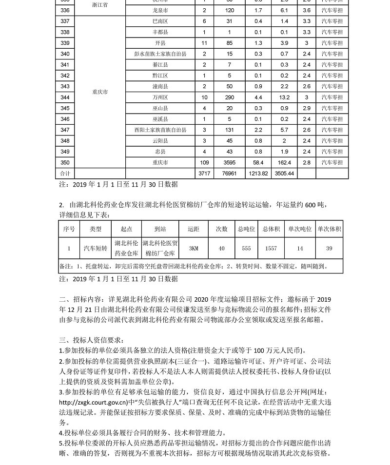 湖北乐竞平台药业有限公司2020年度运输项目招标公示